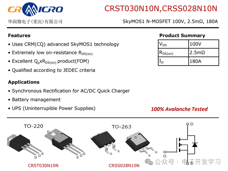 MOS管用的是华润微的CRST030N10N,这个管子我查了一下性能还不错: