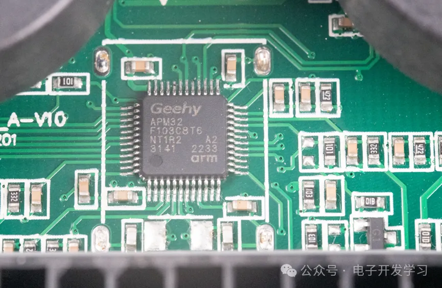 主控芯片用的是珠海极海的APM32F103C8T6,小马哥看型号就知道这个MCU可以无缝替换STM32F103C8T6,但是它的主频更高,是96MHz。