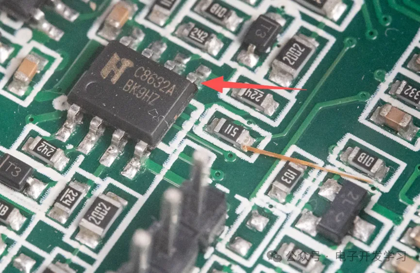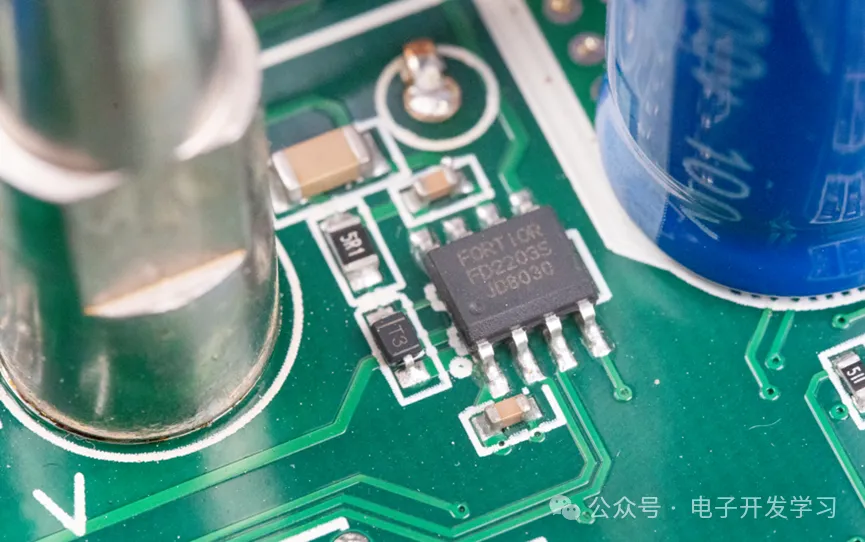 半桥栅极驱动器用的是峰岹的FD2203S。这是一个250V的板桥栅极驱动器,内置欠压保护,驱动器的灌电流是2.3A,拉电流1.6A。