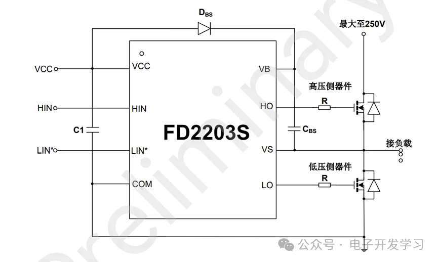 这是FD2203S的应用电路。外围比较简单,除滤波电容外,只需要一个自举二极管和自举电容,栅极驱动电阻这个要根据MOS来定。