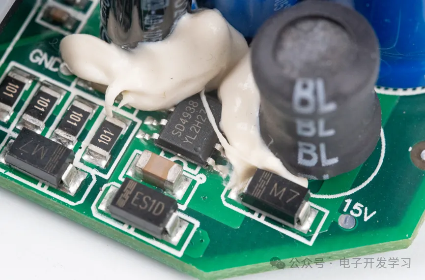 DC-DC型号是士兰微的SD4938TR。旁边有四个100欧的1206电阻并联,看起来是为了分担一部分压降。