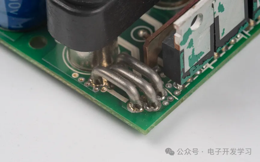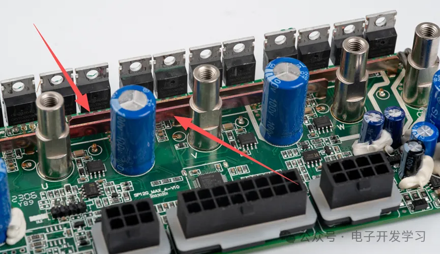 而且在UVW三个输出接线柱到MOS管的引脚之间加了铜板,这样可以极大程度增加过流能力。