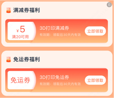 ①3D打印满20-5优惠券(小零件打印满额立减)