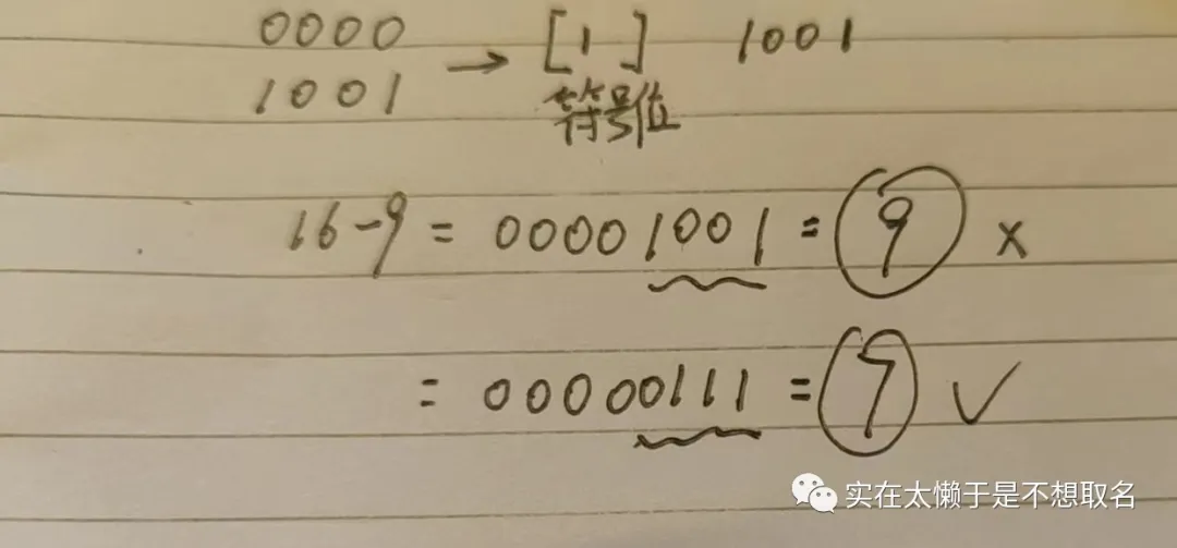 很显然,0111才是正确的结果,那么0111和1001是什么关系呢。哦!!!1001是0111的补码。突然间恍然大悟(死去的计算机原理正在攻击我)。
