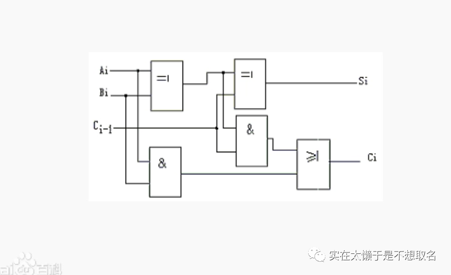 这是一个全加器,结构非常简单,Ai和Bi分别是加数作为输入端, Ci-1是上一个全加器的进位,Si作为本位,Ci作为给下一个全加器的进位,第一个全加器的Ci-1是0,再加上七个这样子的全加器就构成了一个八位加法器。结构非常的巧妙,被大量的运用在了计算机的底层,本质上计算机就是再做复杂的运算。