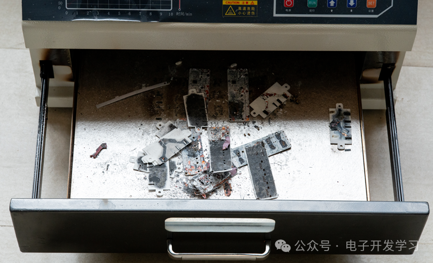前几天焊接一个板子的时候,这炉子直接抽风把板子烧成灰了(里面有一些板子是废板,平时用来支撑的,这次也一并化成灰了)。