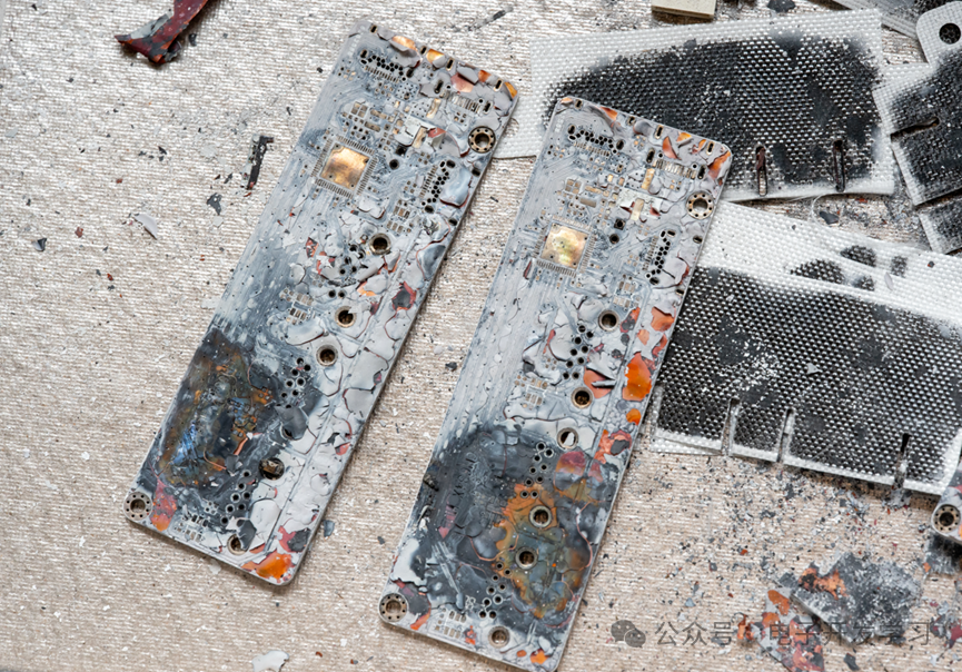 板子背的器件都没有任何损伤。说明之前猜测的电源模块导致异常这个问题大概率不存在。而电源模块的外壳之所以变形是因为仓内温度过高导致变形,也就是说电源模块实际上是受害者。