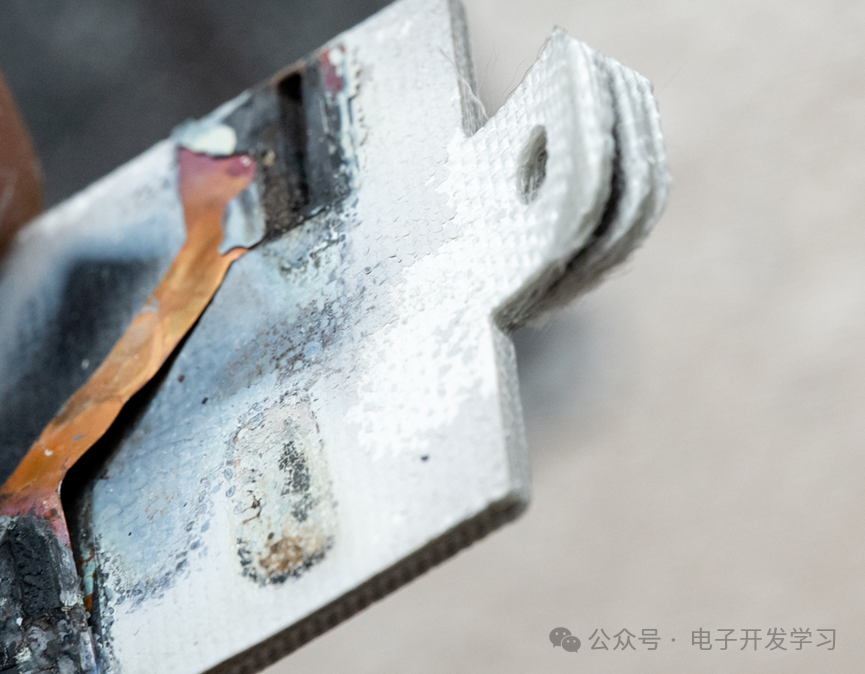 能让板子到这个状态,我不太懂需要多高的温度才能实现。但是我发现了一个新的操作:如果想检测一个PCB厂商做的板子用了几层玻纤布,就把他烧成这个样子,然后一层一层数起来很方便,直接节省了专业切片检测的成本。