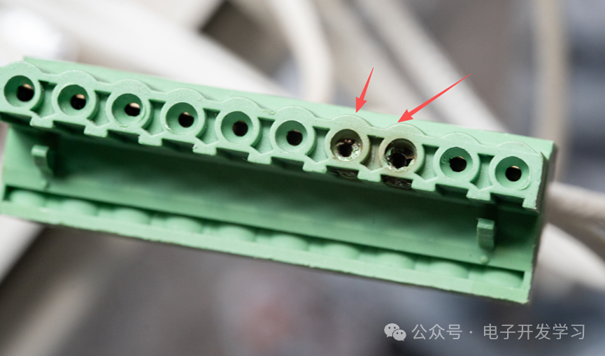 但是我留意到有一个加热管到板子的凤凰端子上,有两个引脚看起来高温变形了。