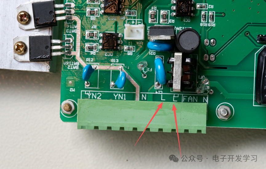 不过板子上这个白色的座子,和其他凤凰端子外观看起来都没有因高温变形,说明那个电源模块的外壳材质耐高温性能还是有待提高的。