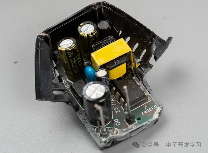 用斜口钳一点一点剪掉外壳,发现电路板在顶部。怪不得变形的时候顶部保持了形状,而底部塑料收缩严重。
