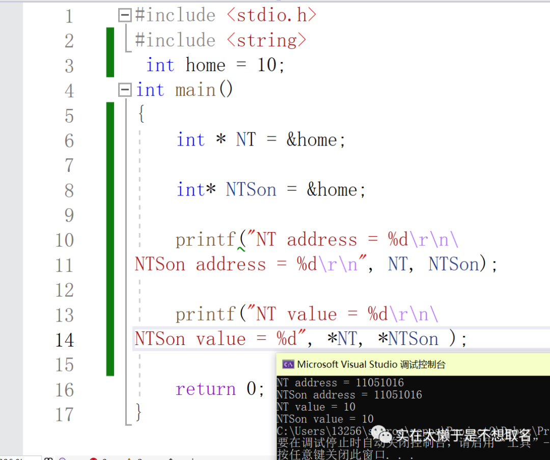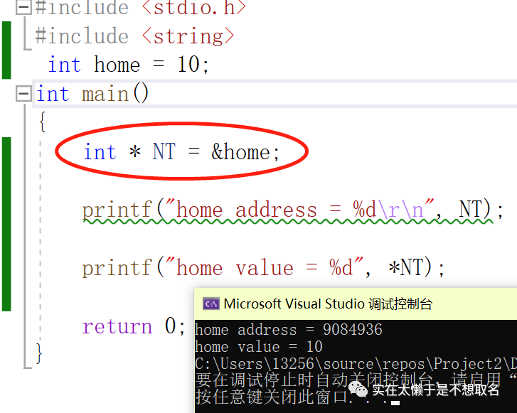 此时int * NT = &home 就像是小区业主在登记信息,向大伙说明,这个地址是NT的家,你可以直接问NT的家在哪来访问我。