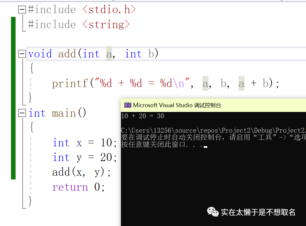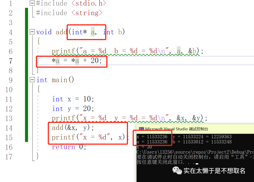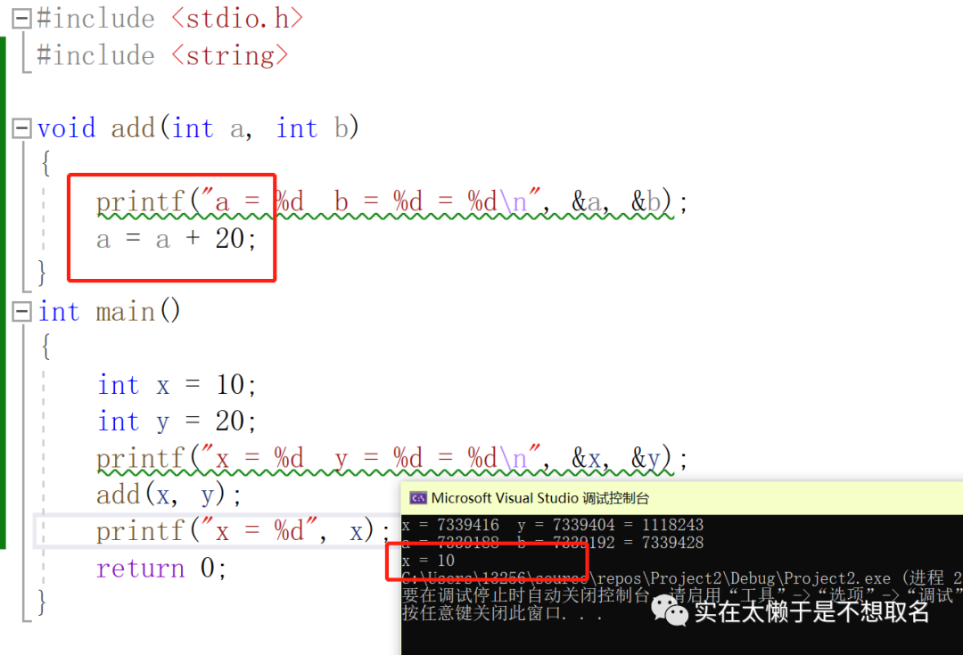 那么a,b,x,y到底是什么关系呢?其实我们可以观察他们的地址,我们发现,实际上我们将x,y传入函数的时候,函数新创建了两个变量a 和b 来存放我们x和y的数据并进行运算,等到这个函数运行完毕再释放掉a和b这两个数据(拆迁)