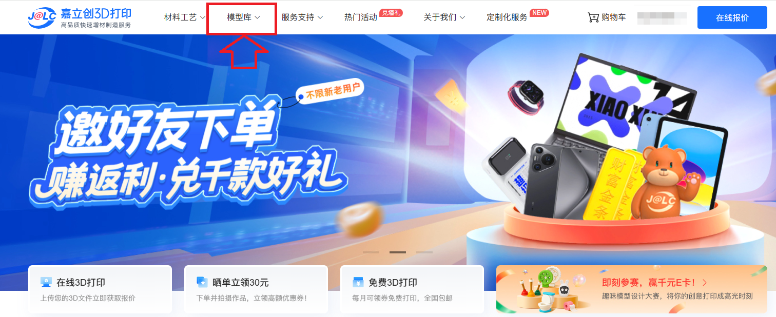 ①官网直达:电脑登录嘉立创3D打印官网→进入【模型库】→点击【手办定制】
