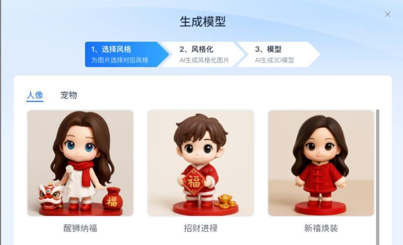 醒狮纳福、招财进禄、新禧焕装中任选1款,系统会自动帮你生成Q版2D形象,支持预览效果,满意再继续。