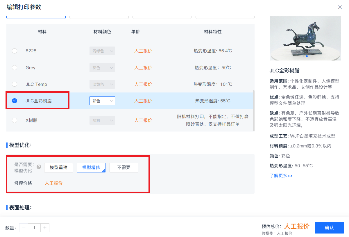 注:①记得选【JLC全彩树脂】材料;②如模型精修难度较大,将按【模型重建】收取费用。