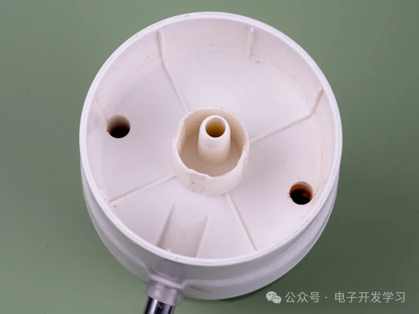 再回头看看壳体内的卫生情况,仔细一看也不容乐观,尤其出水管这里,虽然有一个硅胶套进行防漏防污,但是依然可以看到管道里面有点脏。而且外壳合缝处也没看到防水圈,这让合缝槽里很脏,甚至有小蚊虫的尸体。一说到尸体,突然想到多年前办公室的饮水机里清洗出了一只死去很久的鼠鼠,这成了我多年以来挥之不去的噩梦,以至于从此以后我再也没喝过饮水机接的水。相比而言,这种抽水机虽然简单便宜,但是只要做好密封措施,还是很好的产品形态,毕竟我对蚊子的接纳程度要比对鼠鼠的接纳程度高太多了