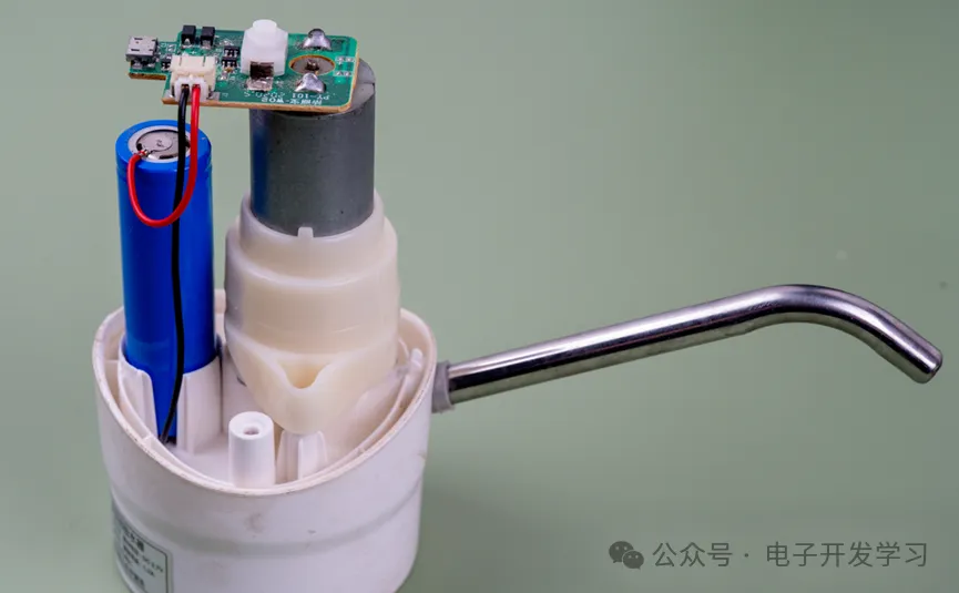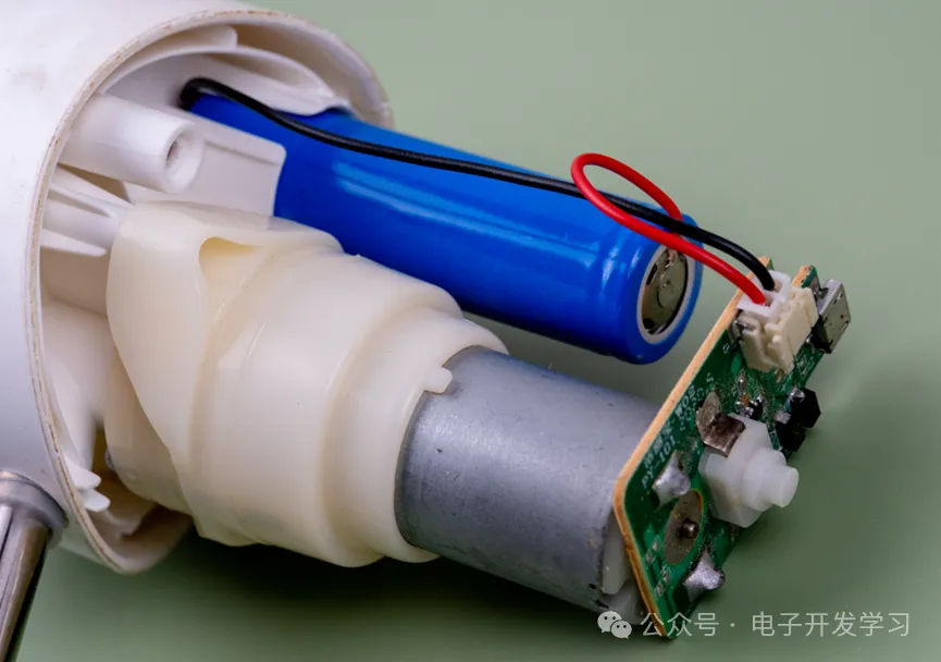 来一睹内部真容。做的很简单。一个水泵尾部带电机,电机尾部焊线端子直接焊接了PCB板。另外一个18650锂电池通过导线连接到PCB板。不得不说这玩意是真的简单,但是还挺好用。