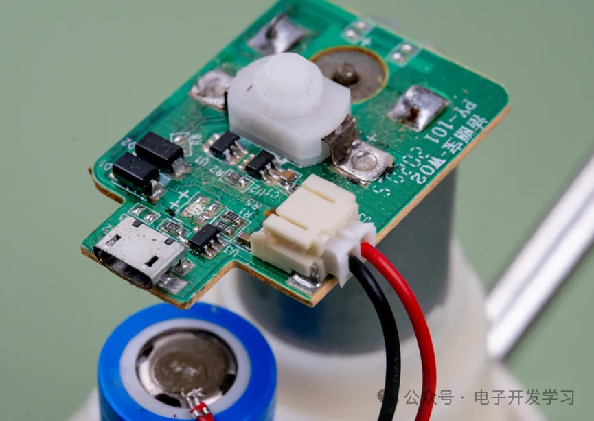 电路板是单面板,看起来也非常简单。但是不知道为啥这个板子看起来有点脏,按道理内腔其他地方都挺干净的,所以板子不应该这么脏啊。充电口还用的是Micro-USB口。板子上就三个芯片。其中一个肯定是锂电池充电芯片,另外开关按键旁边的可能是电机驱动芯片。