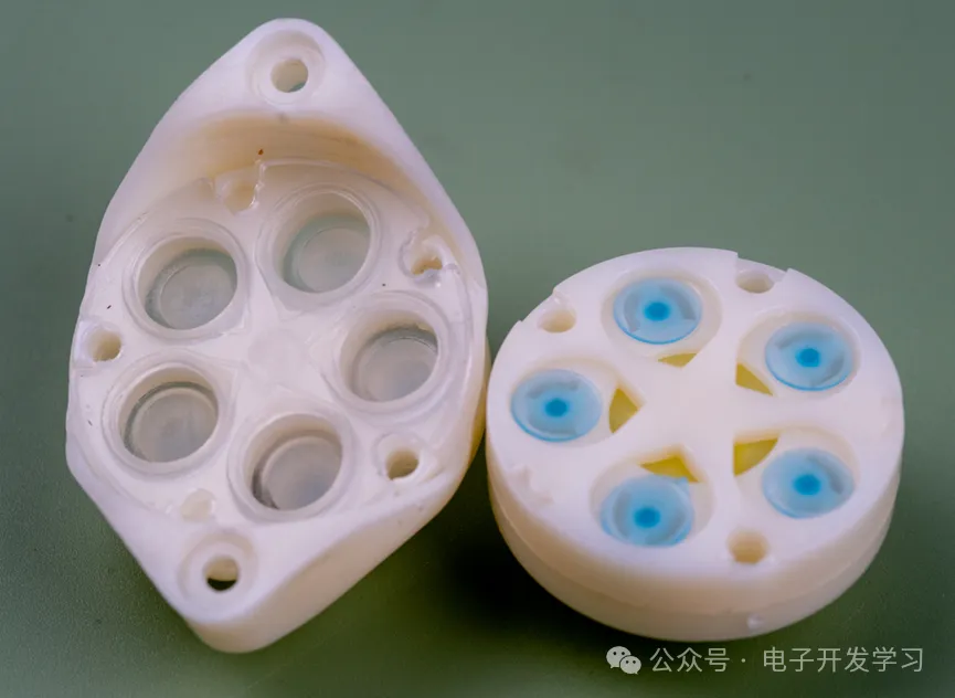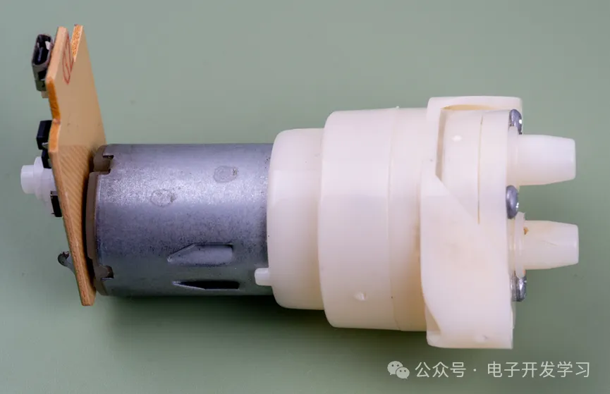 水泵全貌,这种水泵的原理是柱塞泵,从结构上命名又叫做隔膜泵。在一些视频网站上搜柱塞泵原理,就可以找到很形象的动画视频,看一眼就能明白这个水泵是如何抽水的。这种泵在白色小家电里用量非常庞大,比如抽水机、咖啡机、洗手液机,甚至之前我拆解过的儿童玩具泡泡机用的也是类似的构造。