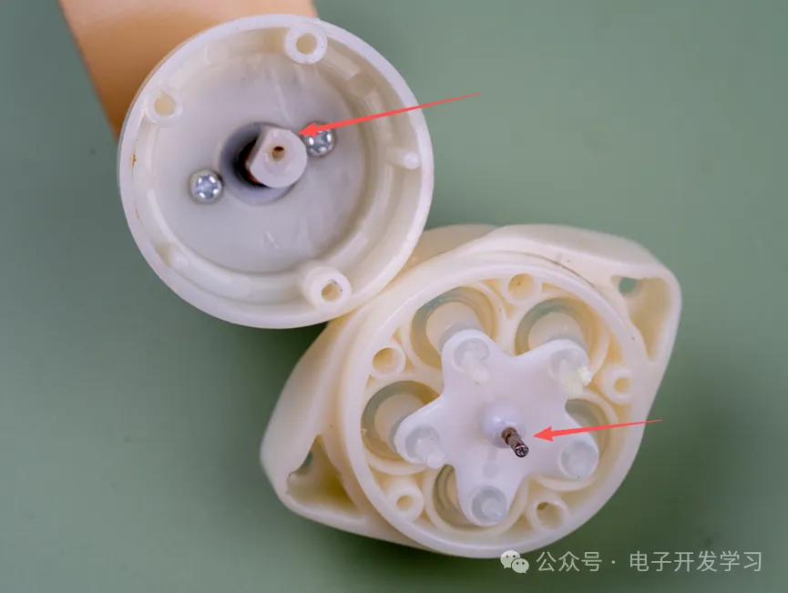 拆开这个结构,可以看到电机出轴上带了一个偏心轮,偏心轮带动整个五角星结构。