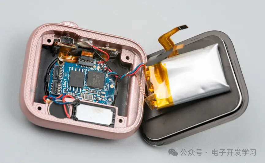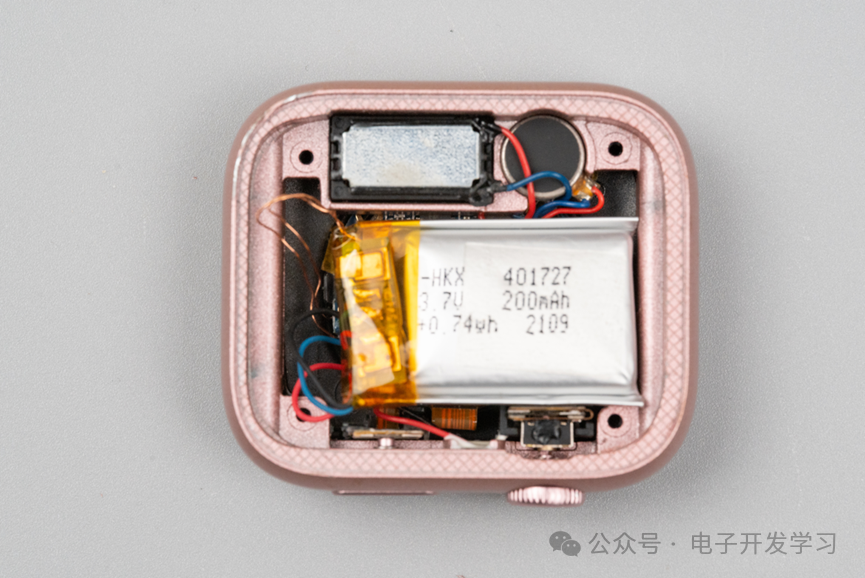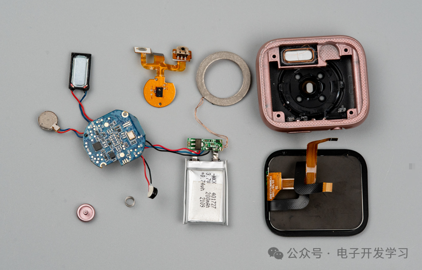 这个手表和以前拆解的几款都不同,很明显它的电池是最大的。相应的可以看到电路板是放在壳体最底部的,看来一切都是为了给电池腾出空间。