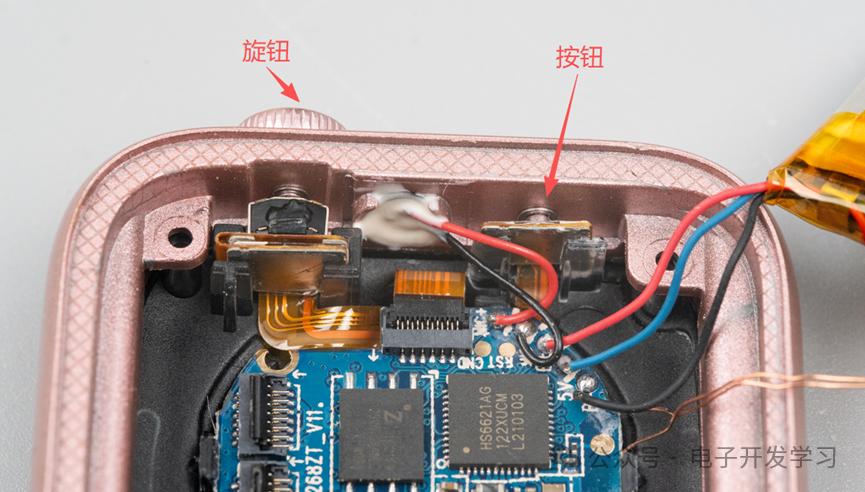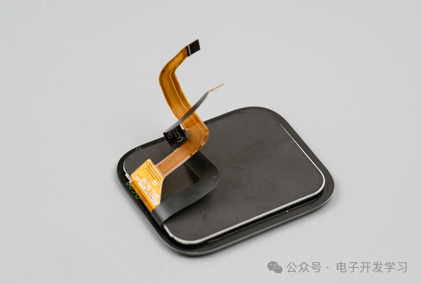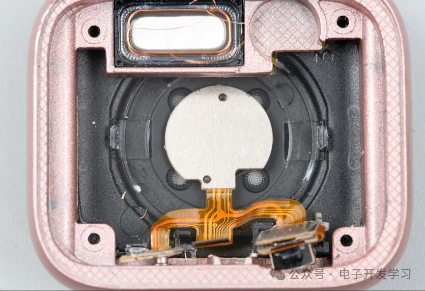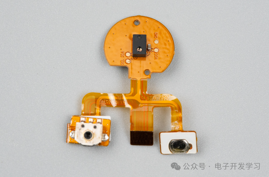 接下来看看壳里还有啥,原来还有一个FPC电路板。这个电路板把编码器、按键、心率传感器电路连接在一起,最终接到主板上。可以看出心率传感器后面背了一个加强钢板。底部有四个led灯的毛玻璃效果的透光孔,刚好没被心率传感器板挡住。