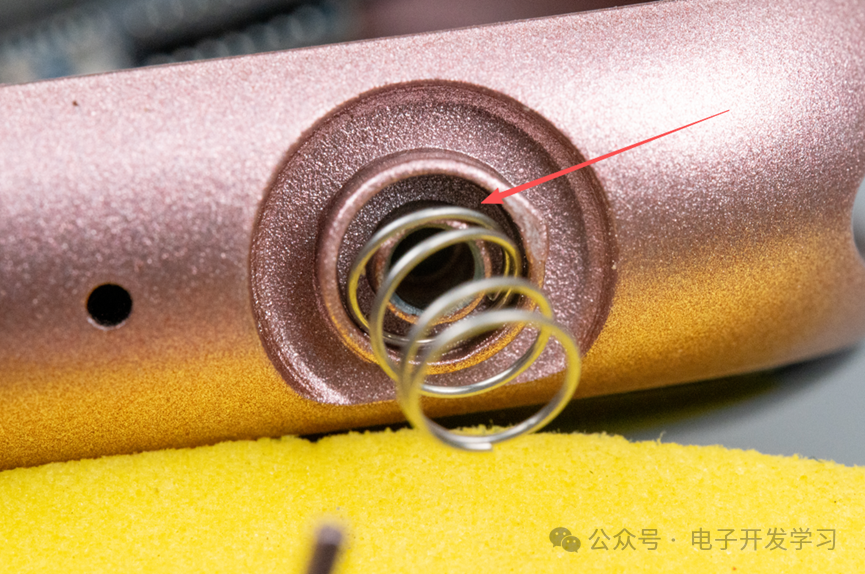 另外它按下去是怎么带弹性可以弹起来的呢?原来是里面有一个小弹簧。