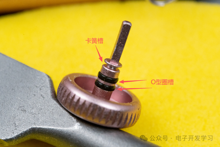 这个旋钮上有三个槽,一个是卡簧槽,两个是O型圈槽,这两个O型圈自然是用来防水的了。旋钮的轴顶部一段横截面是方的,用来拧动编码器。