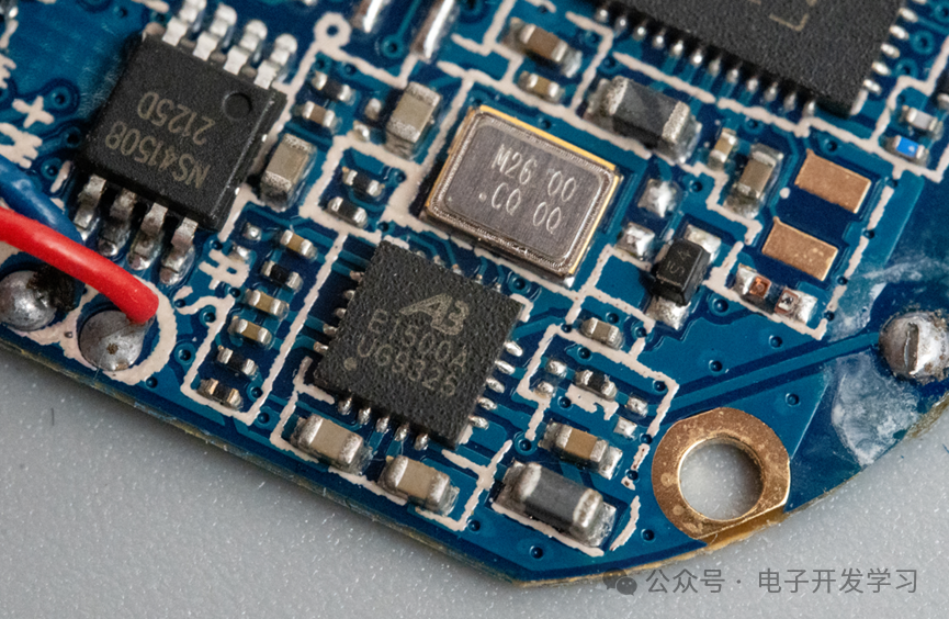 旁边这个QFN-20封装的芯片看Logo是中科蓝汛的芯片,型号是E1500A,这个型号我也没收到是什么芯片,看旁边有一个26MHz的晶振,感觉应该也是蓝牙相关的吧。
