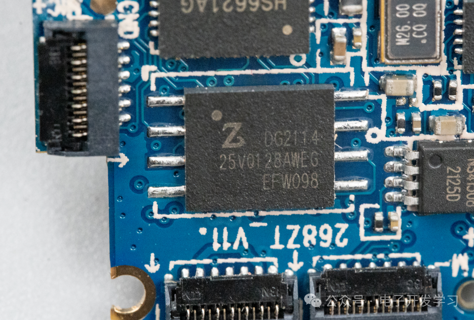 板子上还有一颗看封装就知道是Flash的芯片,根据丝印25VQ128A能确定是来自恒烁的Flash颗粒。