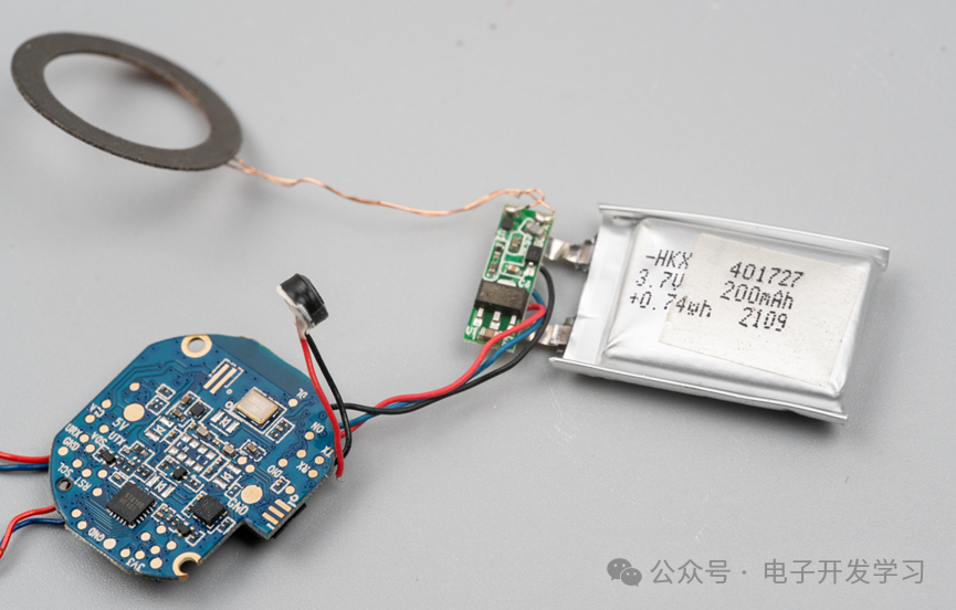 接下来看看电池细节,这个电池是200mAh的容量。保护板上接了充电线圈,引出了三根线,看来除了电源和地还有测温NTC。