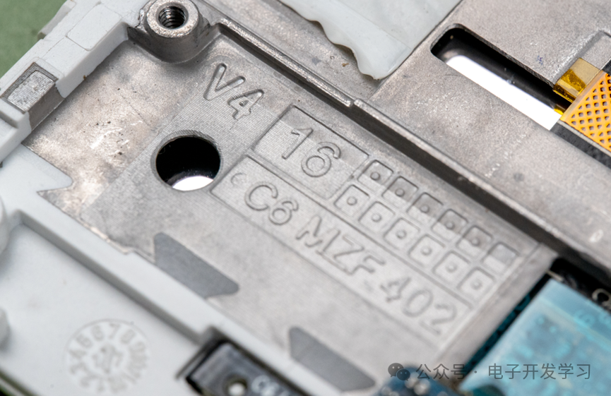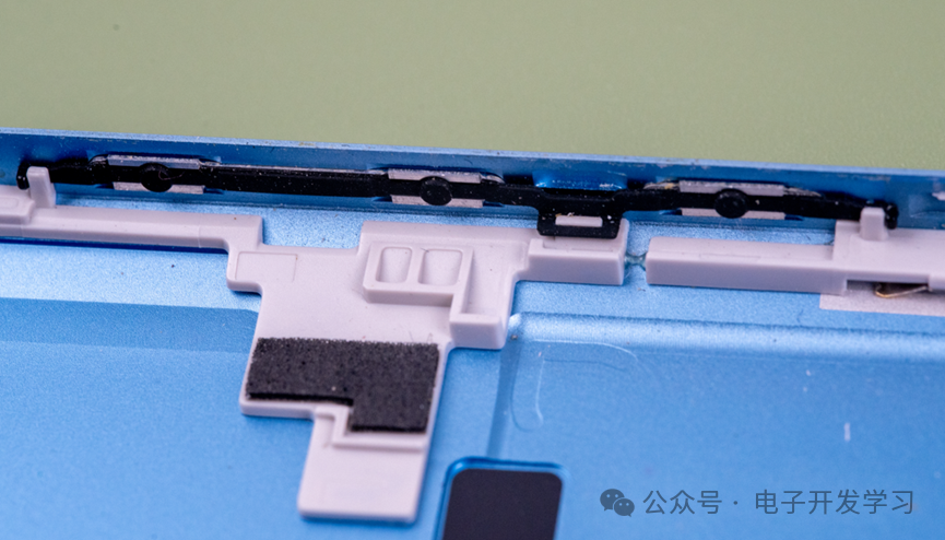 中框是铝合金压铸的,贴了一层很薄的缓冲泡棉,这层泡棉贴在中框和屏幕之间,最主要的作用是填补零件之间存在的微小间隙,避免屏幕和中框直接接触,另外更关键的是,当手机受到轻微挤压或者摔落时,这一层泡棉可以起到缓冲作用,吸收一部分冲击能量,避免屏幕受损。