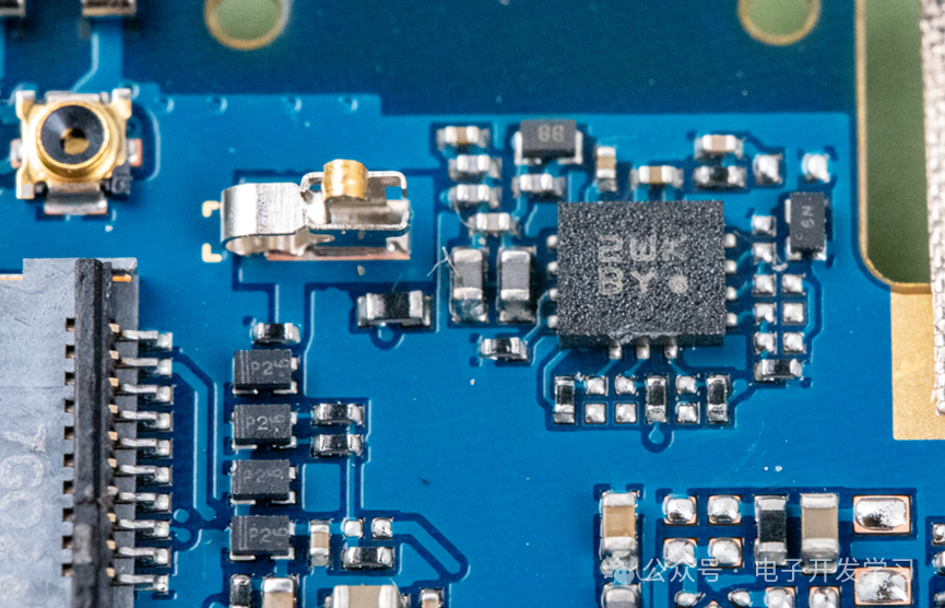 板子另一面也只有一个屏蔽壳可以直接拆解。下面是一个电源管理芯片及其外围电路。