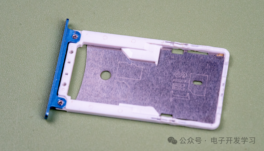 这是SIM卡托的特写。塑料边框加底部黑色金属薄片组成了卡托底盘,再加上左边的蓝色铝合金件构成了整个卡托。
