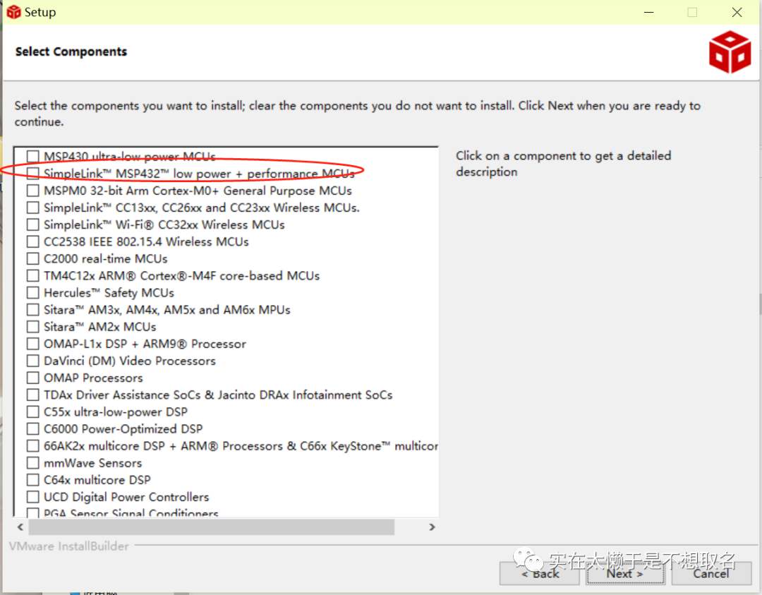 下载完成后找到对应的安装文件,双击进行安装,其他步骤与正常软件安装时无异,但是注意的是在选择产品中,一定要勾选MSP432这个选项后再NEXT。