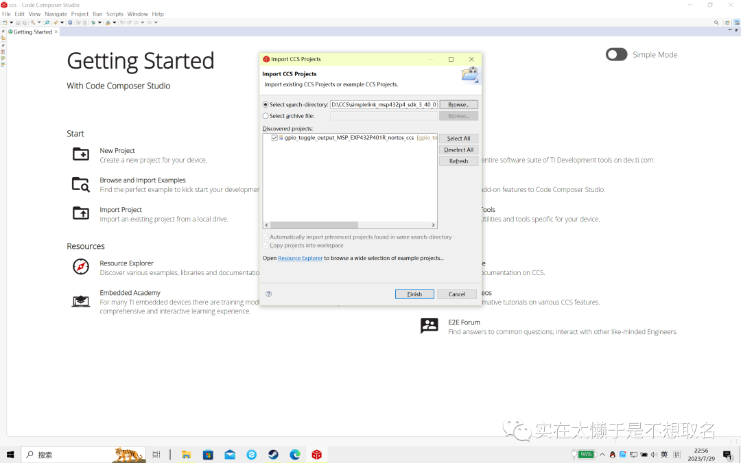 我们打开CCS,在Project中选择import CCS Project ,导入CCS例程。选择我们的例程文件夹,点击finished即可导入工作区完成,之后就可以使用我们的例程了。
