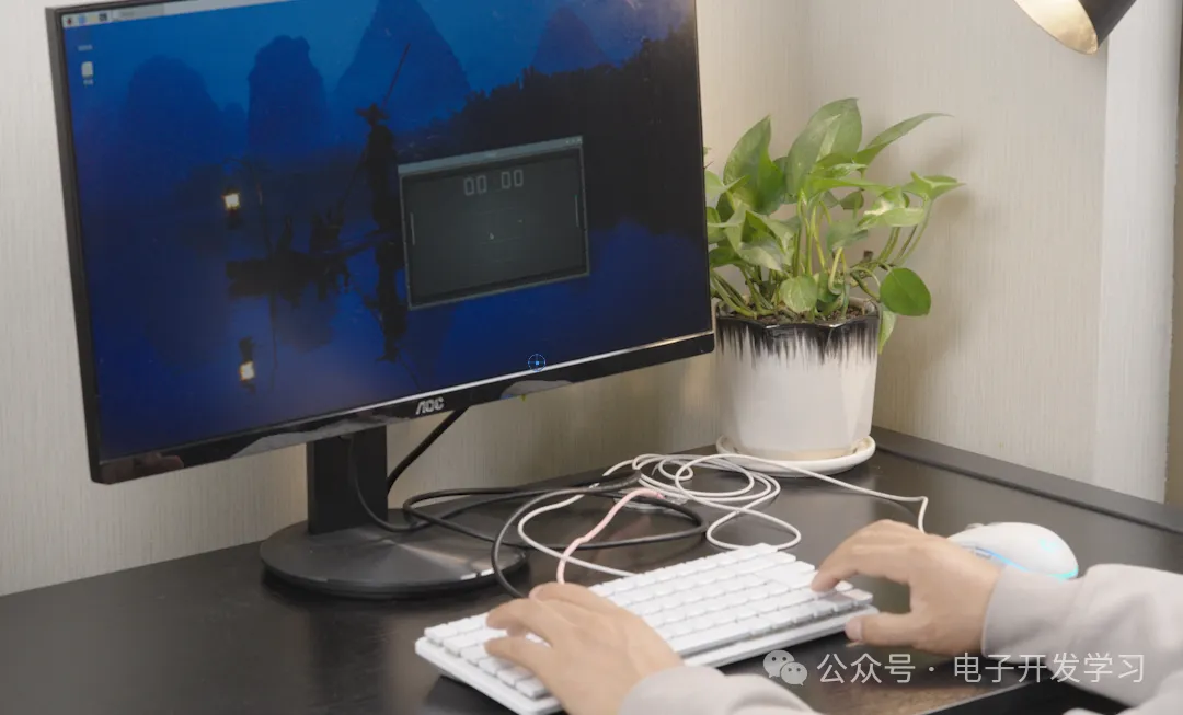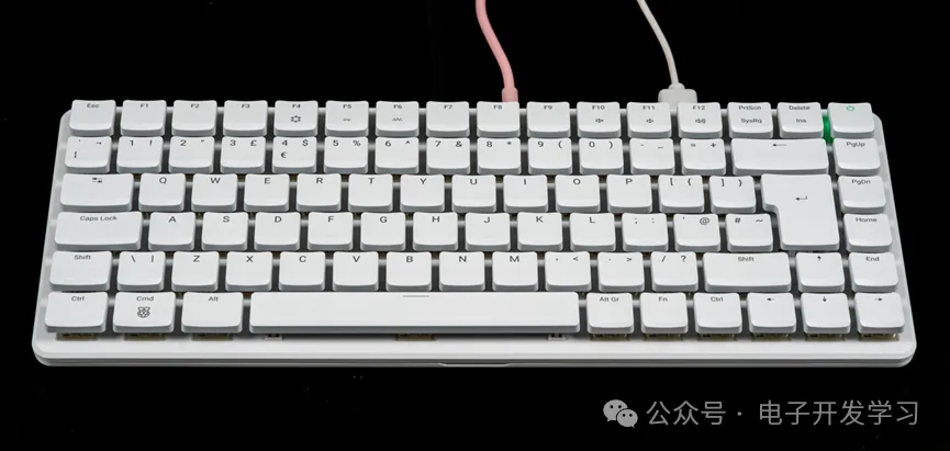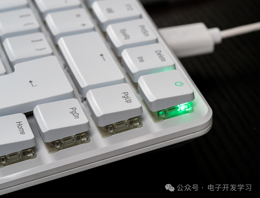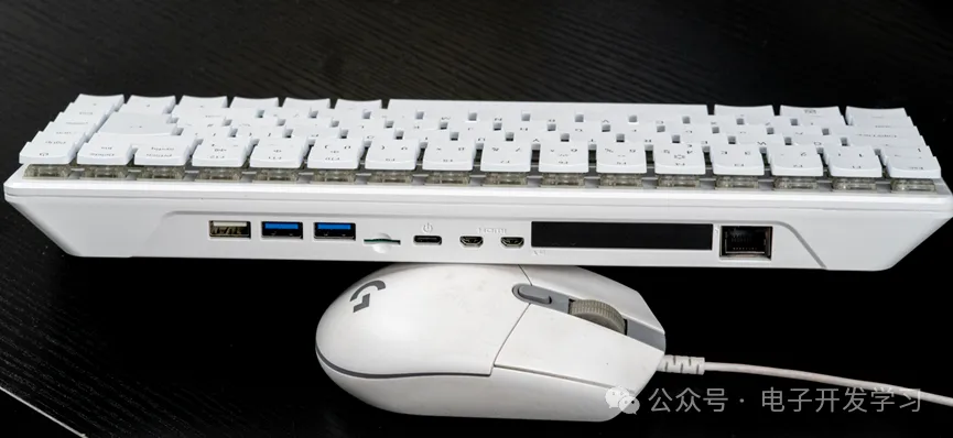 我桌子上有一把白色的机械键盘,你可能认为我把电脑主机放在桌子下面了。但是你如果仔细看就会发现,从这个键盘上引出了三根线,一个是HDMI线连接到了显示器,一个连接鼠标,而另外一根粉色的线实际上只是通过Type-C口为这个“机械键盘”供电。