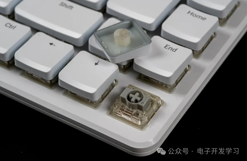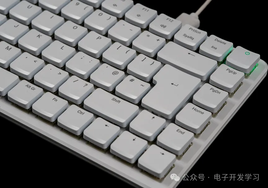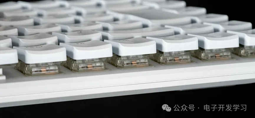 这个键盘采用了比较矮的键帽,行程较短,打字手感很清脆。