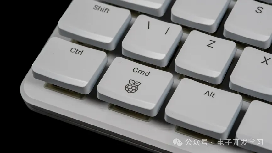常用键盘Win键的位置处是Cmd按键,键帽上有一个树莓派的Logo。