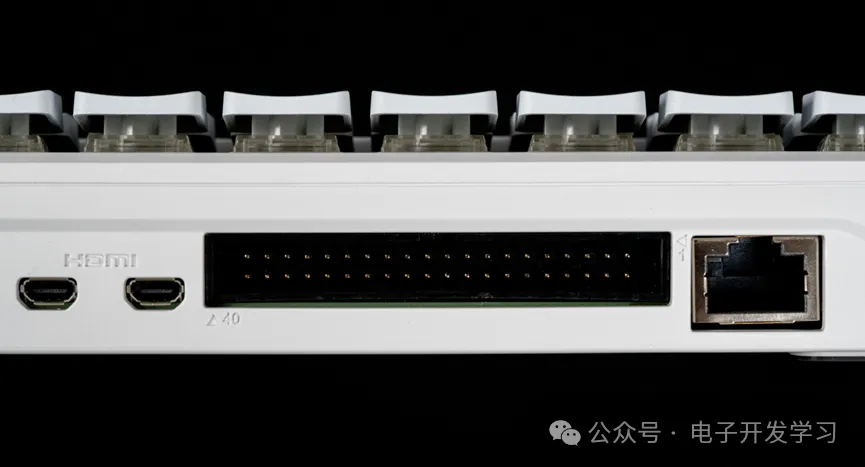 既然说不只是一个机械键盘,还是一台电脑,那一定会有各种接口。所有的接口都在这一个侧面。从左往右依次是USBA2.0、2个USBA3.0、Micro SD卡槽、供电Type-C口、2个微型HDMI接口、一个40Pin的GPIO扩展口、一个千兆以太网口。