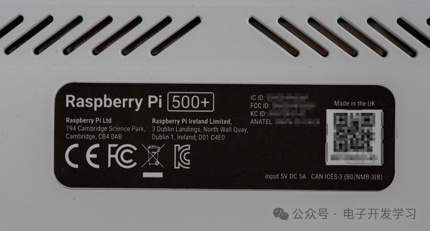 散热槽下面有一个铭牌,上面写了产品的相关信息,这个产品Made in the UK。其输入电源为5V DC 5A。