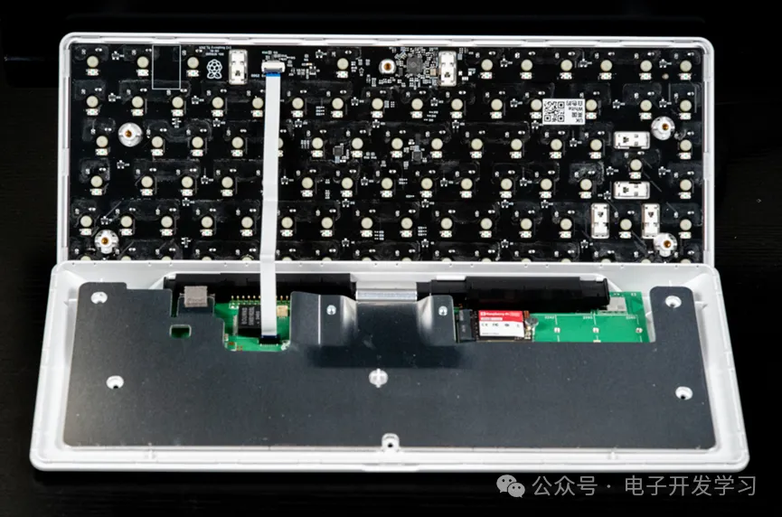 进入拆解环节,拆掉背面的螺丝之后,前后盖分开,这一步基本上也就把机械键盘和电脑主机分开了。二者之间仅通过个白色的FPC排线连接,设计非常简洁。