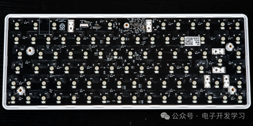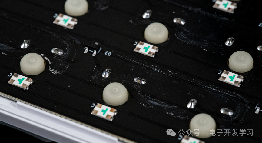 每个机械按键旁边有一个背贴的四脚RGB LED灯。