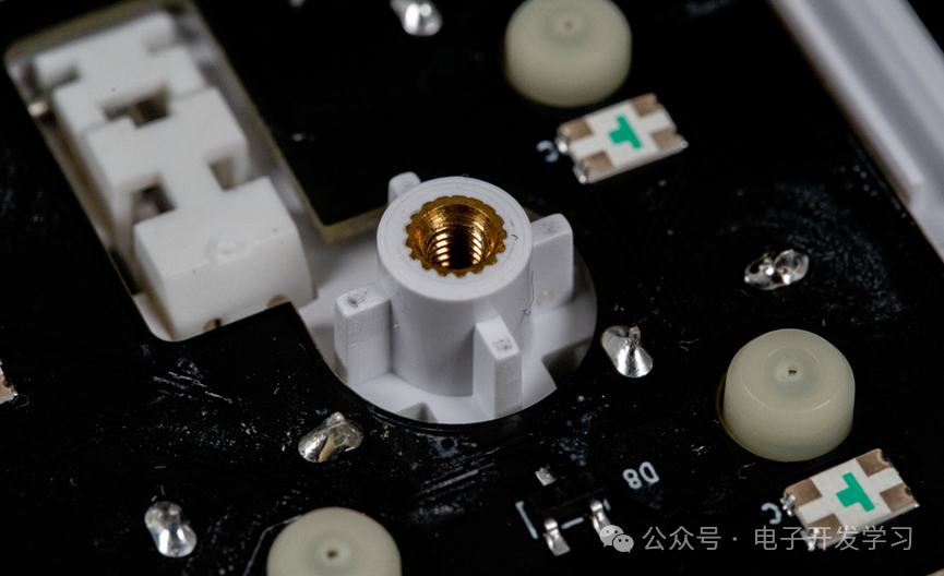 键盘前面板上生长了螺丝孔柱,里面植入了滚花铜螺母,用来安装底壳。