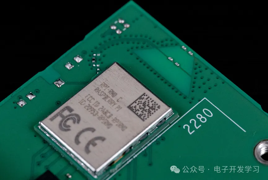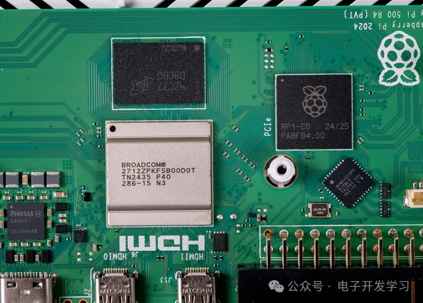 板子上的CPU是来自博通的BCM2712,这是一个2.4GHz的四核64bit ARM Cortex-A76内核的CPU,具备加密扩展,每核心512KB二级缓存和2MB共享三级缓存。旁边的树莓派PR1用来扩展USB3.0和USB2.0接口以及千兆以太网等等,从功能来看,这个芯片有点类似于传统主板上的南桥芯片。