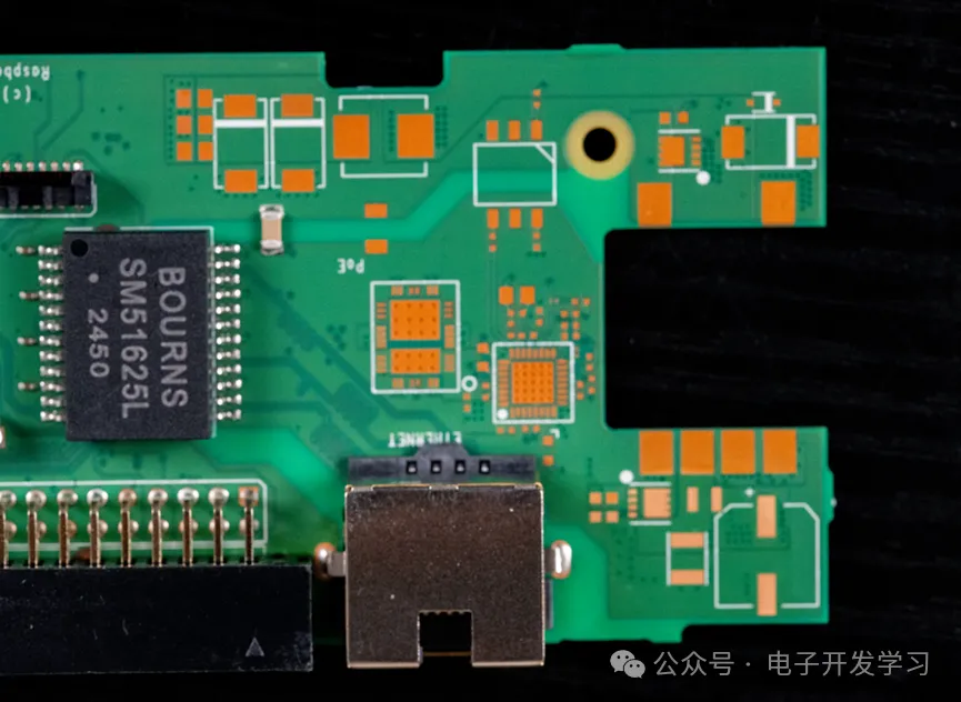 如果仔细看正面这一部分,会发现这个板子表面处理是OSP工艺。看来来这些没有焊接的器件位置是为了支持POE供电。