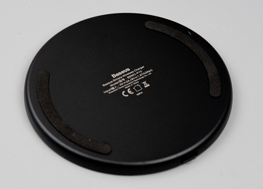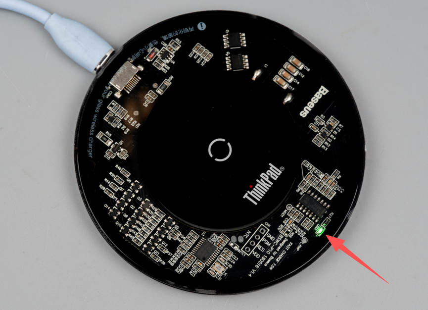 找了个苹果Light线给它供上电之后,这里有一个绿灯闪烁。可惜我手里的安卓机放上去没有反应,手里的苹果机又太老,也没法测试能不能无线充电。