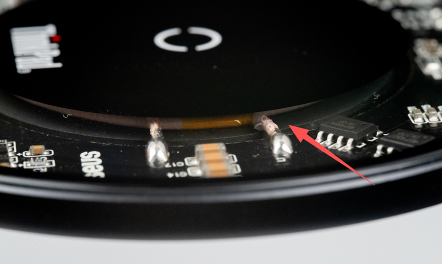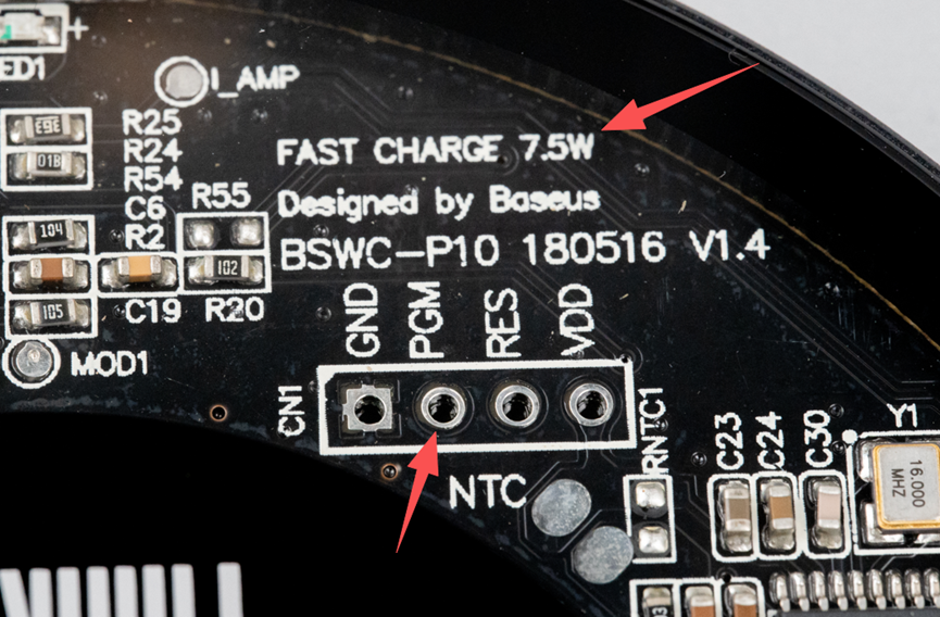 这里有一个2.54x4pin的排针接口,其中的PGM就是给STM8S烧录程序的。而上面写的FAST CHARGE 7.5W令我羞愧难当,我原以为看型号后面的P10,就当它输出功率是10W,结果实际上无线充电的功率只有7.5W。当然,它也不是一无是处,至少比五福一安强那么一点点。
