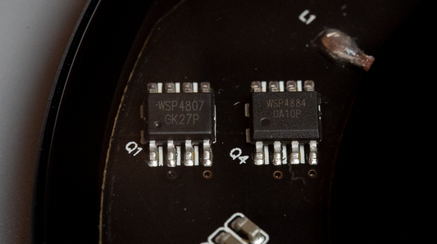 充电开关器件是WSP4807和WSP4884。前者内置两个PMOS,源漏电压30V,连续漏电流8.9A,导通电阻32mΩ。后者内置两个NMOS,源漏电压30V,连续漏电流8.8A,导通电阻23mΩ。